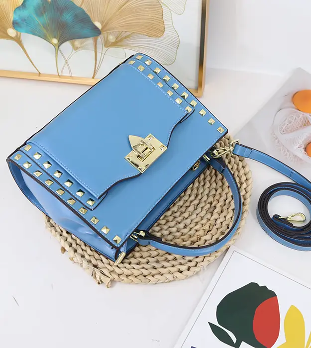 Masivna bravica u središtu torbe daje joj arhitektonsku preciznost, dok ukrasne ivice sa metalnim akcentima stvaraju savršen vizuelni ritam.