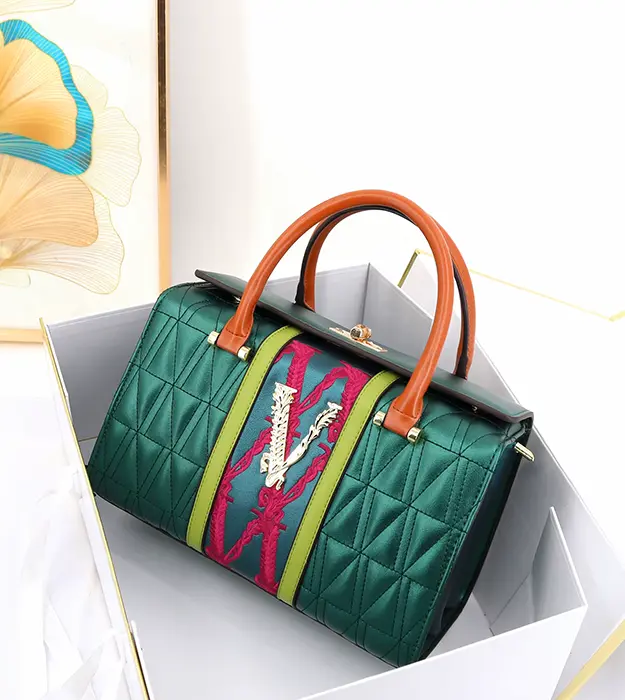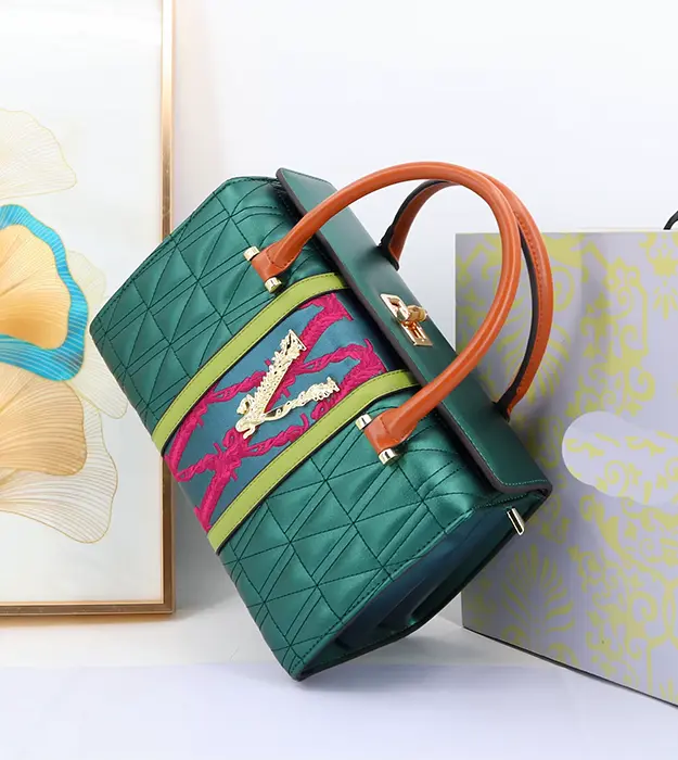 Boja | Zelena sa ružičasto-zlatnim dekorativnim vezom i braon ručkama |