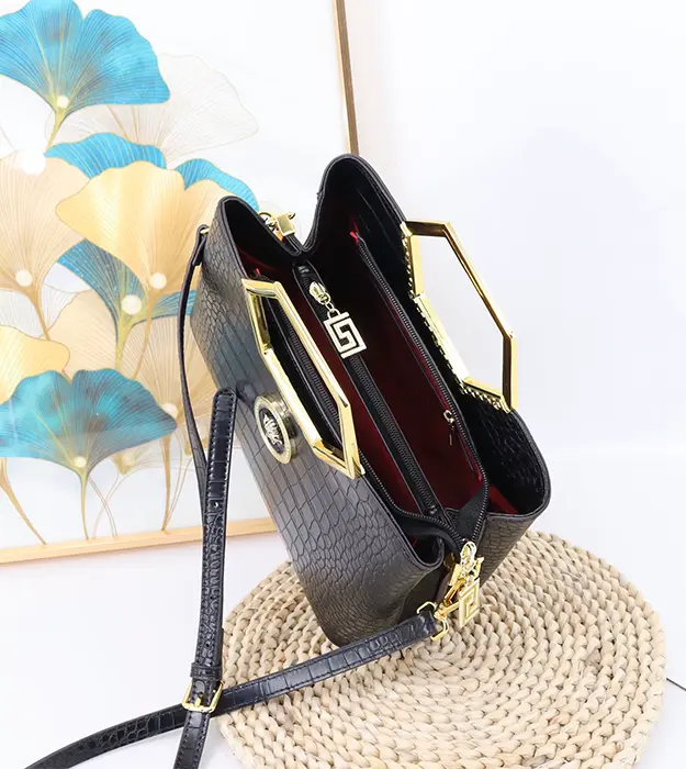 Upoznajte torbu koja redefiniše savremeni pojam elegancije — Leonaria Noir Lux, izrađenu od visokokvalitetne krokodilske PU kože sa prepoznatljivim šestougaonim zlatnim ručkama i centralnim lavljim amblemom koji simbolizuje snagu i profinjenost.