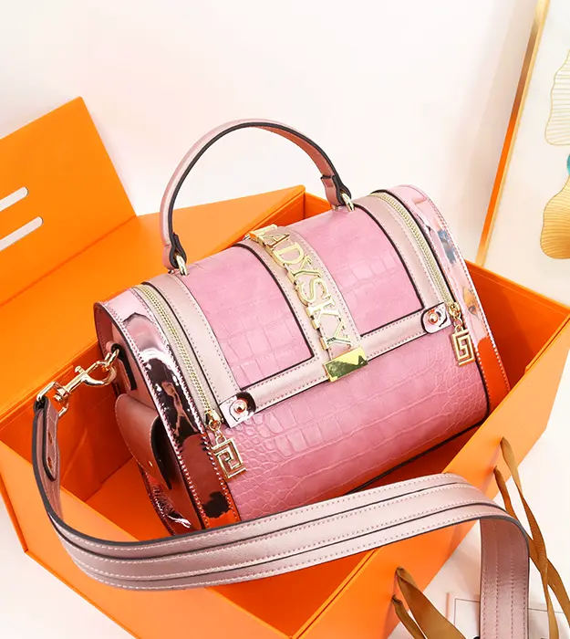 Površina torbe, obložena reljefnim croco uzorkom u nežno ružičastom tonu, simbolizuje sklad između hrabrosti i gracioznosti.